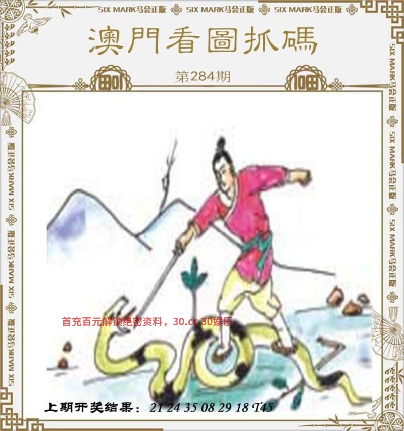 284期:【广西团队协手破解抓码图】【开牛41】 破解图文:一名古装男子持棍打蛇,旁有山石与流水。 综合九肖:蛇马牛虎猴龙狗猪羊 综合十码:25.49.24.41.40.22.38.32.19.23 |