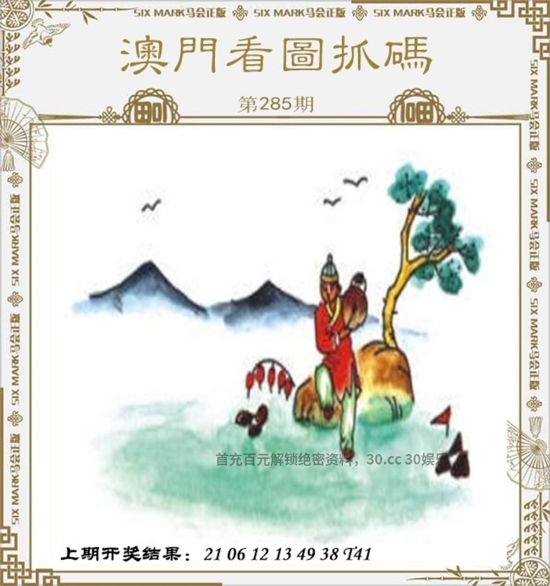 285期:【广西团队协手破解抓码图】【开马24】 破解图文:红衣人抱葫芦状物坐石旁,旁挂风铃与大树远山。 综合九肖:牛龙蛇马羊猴鸡狗猪 综合十码:05.29.38.13.24.35.46.09.32.31 |
